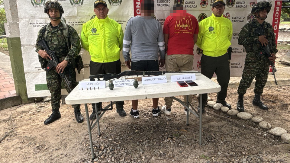 El procedimiento se llevó a cabo en la vereda La Gómez, donde las autoridades lograron ubicar y detener a dos hombres conocidos con los alias de “El Tío” y “Ciro”, señalados de pertenecer a una estructura criminal que delinque en el Magdalena Medio.